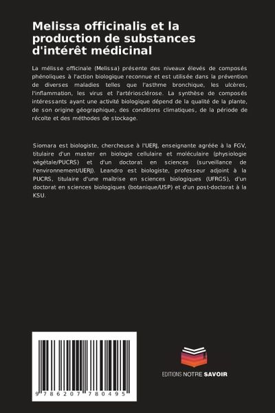 La mélisse officinale (Melissa) présente des niveaux élevés de composés phénoliques à l'action biologique reconnue et est utilisée dans la prévention de diverses maladies telles que l'asthme bronchique, les ulcères, l'inflammation, les virus et l'artériosclérose. La synthèse de composés intéressants ayant une activité biologique dépend de la qualité de la plante, de son origine géographique, des conditions climatiques, de la période de récolte et des méthodes de stockage.