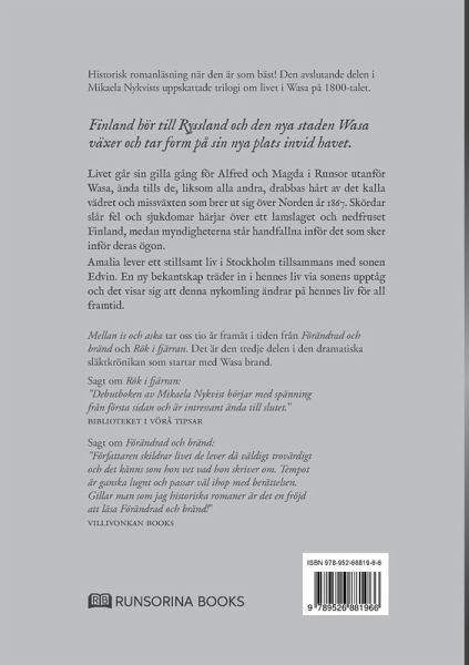 Historisk romanläsning när den är som bäst! Den avslutande delen i Mikaela Nykvists uppskattade trilogi om livet i Wasa på 1800-talet. Finland hör till Ryssland och den nya staden Wasa växer och tar form på sin nya plats invid havet. Livet går sin gilla gång för Alfred och Magda i Runsor utanför Wasa, ända tills de, liksom alla andra, drabbas hårt av det kalla vädret och missväxten som brer ut sig över Norden år 1867. Skördar slår fel och sjukdomar härjar över ett lamslaget och nedfruset Finland, medan myndigheterna står handfallna inför det som sker inför deras ögon. Amalia lever ett stillsamt liv i Stockholm tillsammans med sonen Edvin. En ny bekantskap träder in i hennes liv via sonens upptåg och det visar sig att denna nykomling ändrar på hennes liv för all framtid. Mellan is och aska tar oss tio år framåt i tiden från Förändrad och bränd och Rök i fjärran. Det är den tredje delen i den dramatiska släktkrönikan som startar med Wasa brand.