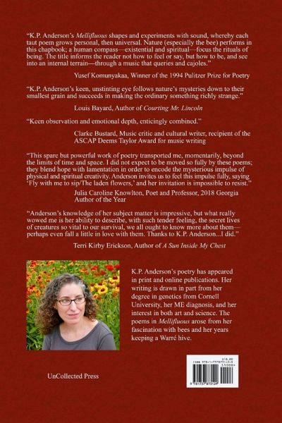 Winner of the UnCollected Press Full Length Book or Chapbook of Poetry Contest, K.P. Anderson's Mellifluous is an exquisitely written, elegant, and refined journey into the interior world of the bee. This chapbook is an intimate, fascinating, and revealing artistic conveyance of one of nature's own works of art. Both empirical in its insightful detail and magical in the beauty of its revelations, this book deftly creates a work of art informed by and informing us of nature's unparalleled artistry. Pulitzer Prize winning poet Yusef Komunyakaa's endorsement of K.P. Anderson's Mellifluous provides a sense of the profound artistry and understanding that makes this book so unique: "K.P. Anderson's Mellifluous shapes and experiments with sound, whereby each taut poem grows personal, then universal. Nature (especially the bee) performs in this chapbook; a human compass-existential and spiritual-focus the rituals of being. The title informs the reader not how to feel or say, but how to be, and see into an internal terrain-through a music that queries and cajoles."
