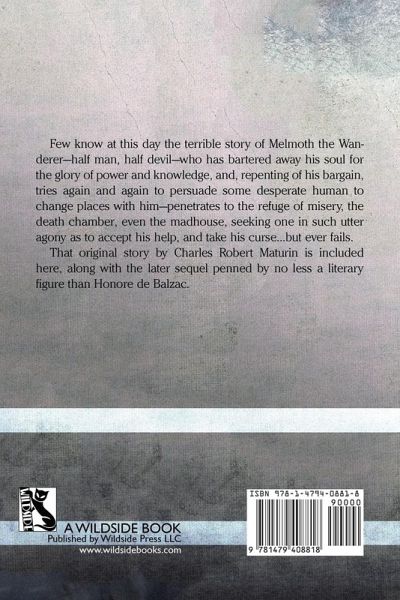 Few know at this day the terrible story of Melmoth the Wanderer -- half man, half devil -- who has bartered away his soul for the glory of power and knowledge, and, repenting of his bargain, tries again and again to persuade some desperate human to change places with him-penetrates to the refuge of misery, the death chamber, even the madhouse, seeking one in such utter agony as to accept his help, and take his curse...but ever fails. That original story by Charles Robert Maturin is included here, along with the later sequel penned by no less a literary figure than Honore de Balzac.