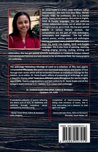 The anthology "Melodious Musings of Love" is a collection of fifty love poems composed by fifty poets throughout the world in the joy of celebrating Valentine's Day. The poets have expressed vivid colors and shades of love through their verses which will be enchanted forever as melodious musings for the readers.