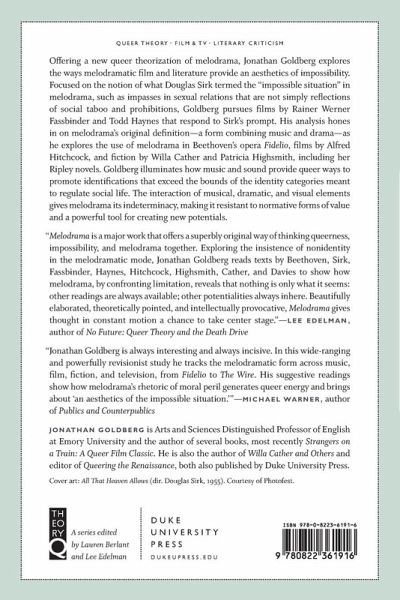 Offering a new queer theorization of melodrama, Jonathan Goldberg explores the ways melodramatic film and literature provide an aesthetics of impossibility. Focused on the notion of what Douglas Sirk termed the "impossible situation" in melodrama, such as impasses in sexual relations that are not simply reflections of social taboo and prohibitions, Goldberg pursues films by Rainer Werner Fassbinder and Todd Haynes that respond to Sirk's prompt. His analysis hones in on melodrama's original definition--a form combining music and drama--as he explores the use of melodrama in Beethoven's opera Fidelio, films by Alfred Hitchcock, and fiction by Willa Cather and Patricia Highsmith, including her Ripley novels. Goldberg illuminates how music and sound provide queer ways to promote identifications that exceed the bounds of the identity categories meant to regulate social life. The interaction of musical, dramatic, and visual elements gives melodrama its indeterminacy, making it resistant to normative forms of value and a powerful tool for creating new potentials.