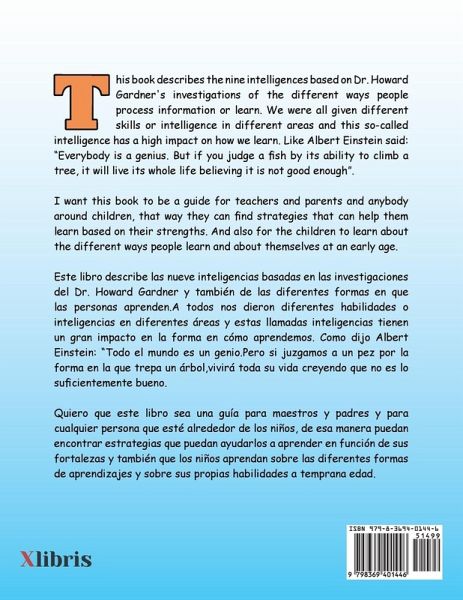 This book describes the nine intelligences based on Dr. Howard Gardner's investigations of the different ways people process information or learn. We were all given different skills or intelligence in different areas and this so-called intelligence has a high impact on how we learn. Like Albert Einstein said: "Everybody is a genius. But if you judge a fish by its ability to climb a tree, it will live its whole life believing it is not good enough". I want this book to be a guide for teachers and parents and anybody around children, that way they can find strategies that can help them learn based on their strengths. And also for the children to learn about the different ways people learn and about themselves at an early age. Este libro describe las nueve inteligencias basadas en las investigaciones del Dr. Howard Gardner y también de las diferentes formas en que las personas aprenden.A todos nos dieron diferentes habilidades o inteligencias en diferentes áreas y estas llamadas inteligencias tienen un gran impacto en la forma en cómo aprendemos. Como dijo Albert Einstein: "Todo el mundo es un genio.Pero si juzgamos a un pez por la forma en la que trepa un árbol,vivirá toda su vida creyendo que no es lo suficientemente bueno. Quiero que este libro sea una guía para maestros y padres y para cualquier persona que esté alrededor de los niños, de esa manera puedan encontrar estrategias que puedan ayudarlos a aprender en función de sus fortalezas y también que los niños aprendan sobre las diferentes formas de aprendizajes y sobre sus propias habilidades a temprana edad.