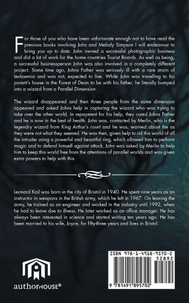 For those of you who have been unfortunate enough not to have read the previous books involving John and Melody Simpson I will endeavour to bring you up to date. John owned a successful photographic business and did a lot of work for the home countries Tourist Boards. As well as being, a successful businessperson John was also involved in a completely different project. Some time ago, Johns Father was seriously ill with a rare strain of leukaemia and was not, expected to live. While John was travelling to his parent's house in the Forest of Dean to be with his father, he literally bumped into a wizard from a Parallel Dimension. The wizard disappeared and then three people from the same dimension appeared and asked Johns help in capturing the wizard who was trying to take over the other world. In repayment for his help, they cured Johns Father and he is now in the best of health. John was, contacted by Merlin, who is the legendry wizard from King Arthur's court and he was, warned about the as they were not what they seemed. He was then, given help to rid this world of all the intruder using a powerful and beautiful ring, which allowed him to perform magic and to defend himself against attack. John was asked by Merlin to help him to keep this world free from the attentions of parallel worlds and was given extra powers to help with this.