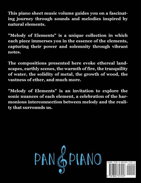 Welcome to the extraordinary sheet music collection "Melody of Elements". Whether you are a passionate musician or a simple music lover, you will embark on a enchanting sonic journey where every note and chord evoke the spirits of the elements: air, earth, fire, water, metal, wood, ether, light, darkness, and quintessence. Music becomes the spell that connects man to the earth, the fire that ignites passion, the water that soothes the soul, the metal that brings strength, the wood that symbolizes growth, and the ether that envelops everything in a harmonious embrace. Experience the essence of each element as you play and listen to this extraordinary collection of piano sheet music.