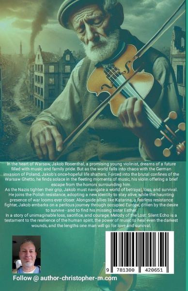 In the heart of Warsaw, Jakob Rosenthal, a promising young violinist, dreams of a future filled with music and family pride. But as the world falls into chaos with the German invasion of Poland, Jakob's once-hopeful life shatters. Forced into the brutal confines of the Warsaw Ghetto, he finds solace only in the fleeting moments of music, his violin offering a brief escape from the horrors surrounding him. As the Nazis tighten their grip, Jakob must navigate a world of betrayal, loss, and survival. He joins the Polish resistance, adopting a new identity to stay alive, while the haunting presence of war looms ever closer. Alongside allies like Katarina, a fearless resistance fighter, Jakob embarks on a perilous journey through occupied Europe, driven by the desire to survive-and to find his missing sister, Esther. In a story of unimaginable loss, sacrifice, and courage, Melody of the Lost: Silent Echo is a testament to the resilience of the human spirit, the power of music to heal even the darkest wounds, and the lengths one man will go to for love and survival.