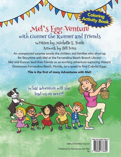An Exciting Coloring Activity Book with Maze, Word Search and Original Written Music Lyrics to Mel's "Going on an Egg Hunt" song that she penned into "Mel's Egg-Venture with Gunner the Runner and Friends". Children and adults will enjoy this Coloring Activity Book full of Interactive and exciting activities, searching for Colorful Eggs downtown Historic Fernandina Beach, Florida. An unexpected surprise awaits the children and families who show up for Storytime with Mel at the Fernandina Beach Branch Library! Mel and Gunner (Her Boxer Puppy Friend) lead their friends on an exciting adventure exploring Historic Downtown Fernandina Beach, Florida, on a quest to find Colorful Eggs. This is the first of many Adventures with Mel! My Action/Song Picture Book What an adventure. This fun activity, created by Michelle E. Forde, has parents, relatives and friends, sing and act out, her picture book as she leads them on an Egg-Venture downtown Fernandina Beach to find colorful egg The story was written by Michelle Forde, Youth Services Program Coordinator with the Nassau County Public Library System. She wrote a fun song for her story, that would help teach and enhance fine motor skills, listening skills, sequencing skills, following directions, sharing, colors, counting, rhythm, rhyming, opposites, and overall literacy and vocabulary skills. Her goal and desire is to lead children and caregivers on an exciting adventure creating a new learning experience at each Storytime. Michelle's Going on an Egg Hunt and Egg-Venture with Mel, actions and song was an instant hit with the children, and her Parent/Caregivers loved it. They wanted her to sing it every week. She purchased Egg Shakers to add actions to the story and gave them to the children who came to see the show. As they all sung along, an assortment of colorful eggs hid in Michelle's pocket. At the right moment, she would pull out a colorful egg and shake it. The song and actions ended, with everyone holding up their eggs, and shaking them high in the air "These are all of the colorful eggs we found" By popular demand, and the encouragement of her parents, caregivers, and the children who so loved this story/sing-along, Michelle now offers Going on an Egg Hunt as a book.