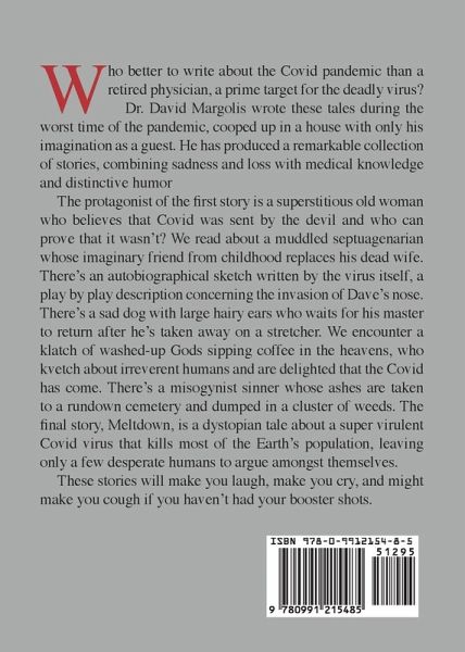 Who better to write about the Covid pandemic than a retired physician, a prime target for the deadly virus? Dr. David Margolis wrote these tales during the worst time of the pandemic, cooped up in a house with only his imagination as a guest. He has produced a remarkable collection of stories, combining sadness and loss with medical knowledge and distinctive humor The protagonist of the first story is a superstitious old woman who believes that Covid was sent by the devil and who can prove that it wasn't? We read about a muddled septuagenarian whose imaginary friend from childhood replaces his dead wife. There's an autobiographical sketch written by the virus itself, a play by play description concerning the invasion of Dave's nose. There's a sad dog with large hairy ears who waits for his master to return after he's taken away on a stretcher. We encounter a klatch of washed-up Gods sipping coffee in the heavens, who kvetch about irreverent humans and are delighted that the Covid has come. There's a misogynist sinner whose ashes are taken to a rundown cemetery and dumped in a cluster of weeds. The final story, Meltdown, is a dystopian tale about a super virulent Covid virus that kills most of the Earth's population, leaving only a few desperate humans to argue amongst themselves.