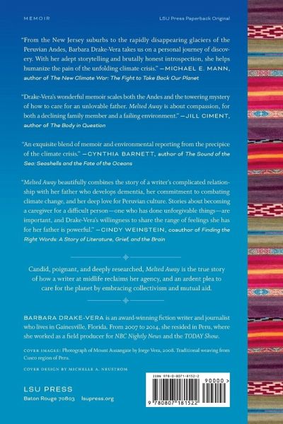 A prolific poet as a child, Barbara Drake-Vera loved writing almost as much as she adored her father, a moody postal employee with an elaborate comb-over and a fondness for Mahler. But when her successes sparked his rage, Barbara silenced her voice for years, terrified even to see her name in print. By age forty-nine, she was a professional journalist living in Peru and collaborating with her husband, a Peruvian-born photographer, to report on melting glaciers in the Andes, far from the reach of her father. Melted Away recounts what happens after her father is diagnosed with advancing Alzheimer's and Barbara takes him into her home in Lima, beginning a process of self-discovery that uncovers a path toward personal and family healing. A diverse group of allies support her on this quest: a trio of caregiving women from the provinces, who serve as home-health aides; a mischievous, Cervantes-quoting, nonagenarian suitor; and a stubborn alpaca herder who lives beneath a long-worshipped, life-sustaining Andean glacier now melting from rapid climate change. Candid, poignant, and deeply researched, Melted Away is the true story of how a writer at midlife reclaims her agency, and an ardent plea to care for the planet by embracing collectivism and mutual aid.