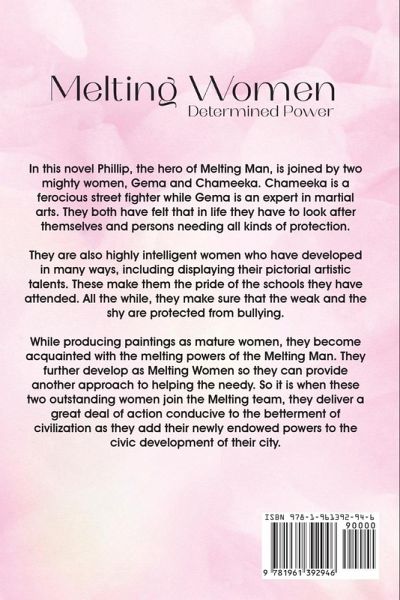 In this novel Phillip, the hero of Melting Man, is joined by two mighty women, Gema and Chameeka. Chameeka is a ferocious street fighter while Gema is an expert in martial arts. They both have felt that in life they have to look after themselves and persons needing all kinds of protection. They are also highly intelligent women who have developed in many ways, including displaying their pictorial artistic talents. These make them the pride of the schools they have attended. All the while, they make sure that the weak and the shy are protected from bullying. While producing paintings as mature women, they become acquainted with the melting powers of the Melting Man. They further develop as Melting Women so they can provide another approach to helping the needy. So it is when these two outstanding women join the Melting team, they deliver a great deal of action conducive to the betterment of civilization as they add their newly endowed powers to the civic development of their city.