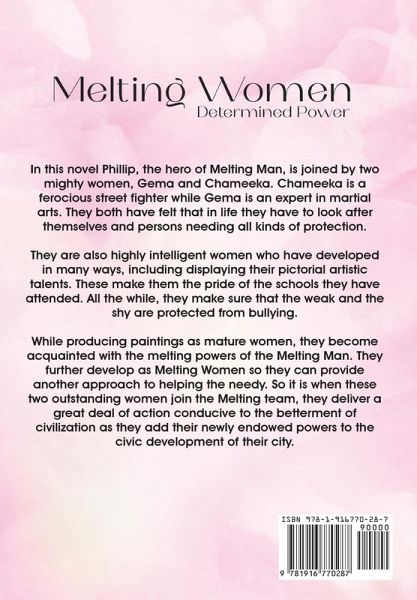 In this novel Phillip, the hero of Melting Man, is joined by two mighty women, Gema and Chameeka. Chameeka is a ferocious street fighter while Gema is an expert in martial arts. They both have felt that in life they have to look after themselves and persons needing all kinds of protection. They are also highly intelligent women who have developed in many ways, including displaying their pictorial artistic talents. These make them the pride of the schools they have attended. All the while, they make sure that the weak and the shy are protected from bullying. While producing paintings as mature women, they become acquainted with the melting powers of the Melting Man. They further develop as Melting Women so they can provide another approach to helping the needy. So it is when these two outstanding women join the Melting team, they deliver a great deal of action conducive to the betterment of civilization as they add their newly endowed powers to the civic development of their city.