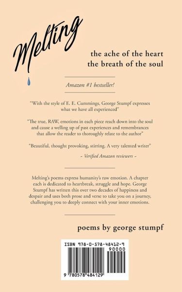 George Stumpf was raised in Pennsylvania and attended Milton Hershey, a school for children of low income, limited resources and social need. It was there on the farm where he milked cows, paving the way to becoming a distinguished honors student, three sport athlete and entrepreneur. He majored in Engineering at the University of Pittsburgh before finding acting, picking up minors in Theatre Arts and English Lit. He performed in Regional theatre and Off-Broadway productions, including several Shakespeare plays and has most recently performed at Upright Citizens Brigade. Over the year, he has received countless roles in soaps, tv shows, independent film, print and commercials. You can find all of his work at imdb.com/georgestumpf. HIs writing career took off with his indie screenplay, "Passed On", which was a quarterfinalist in the 2009 American Zoetrope Screenplay Contest. He followed that up with a sitcom pilot, "My Two Friends", which placed fourth in the 2011 LA Comedy Festival's Screenplay Competition. Currently, his ebook is an Amazon #1 bestseller. Personal note from the author: I am so honored to share Melting with you! This is all so crazy because I never actually set out to write a book nor had I ever thought poetry would be something that would inspire me. Melting is an accumulation of poems written over the years when I was, emotionally, at my most raw. If a relationship ended or if I needed to get something off my chest, I just wrote. Last year, I pulled my writings out from under the bed and friends made me realize that some were actually pretty good... this book is the result. Putting words on paper really helped get me through some tough times and I am encouraging you, especially if you struggling with mental health issues, to do the same, to share their thoughts and feelings. It doesn't have to be poetry or even writing. It can be through song, dance or whichever creative outlet you want to explore. My main intention with this book is to inspire you. I am the perfect example that, if you just follow your heart, anything can be done. I put this challenge to you-- please message me with updates along your journey! instagram.com/meltingpoems facebook.com/melting.poems twitter.com/melting poems
