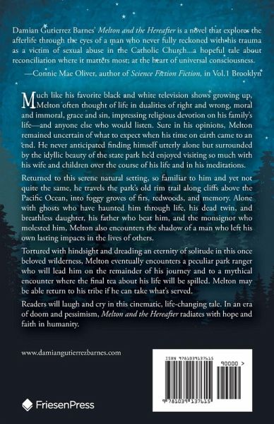 Much like his favorite black and white television shows growing up, Melton often thought of life in dualities of right and wrong, moral and immoral, grace and sin, impressing religious devotion on his family's life-and anyone else who would listen. Sure in his opinions, Melton remained uncertain of what to expect when his time on earth came to an end. He never anticipated finding himself utterly alone but surrounded by the idyllic beauty of the state park he'd enjoyed visiting so much with his wife and children over the course of his life and in his meditations. Returned to this serene natural setting, so familiar to him and yet not quite the same, he travels the park's old rim trail along cliffs above the Pacific Ocean, into foggy groves of firs, redwoods, and memory. Alone with ghosts who have haunted him through life, his dead twin, and breathless daughter, his father who beat him, and the monsignor who molested him, Melton also encounters the shadow of a man who left his own lasting impacts in the lives of others. Tortured with hindsight and dreading an eternity of solitude in this once beloved wilderness, Melton eventually encounters a peculiar park ranger who will lead him on the remainder of his journey and to a mythical encounter where the final tea about his life will be spilled. Melton may be able return to his tribe if he can take what's served. Readers will laugh and cry in this cinematic, life-changing tale. In an era of doom and pessimism, Melton and the Hereafter radiates with hope and faith in humanity.