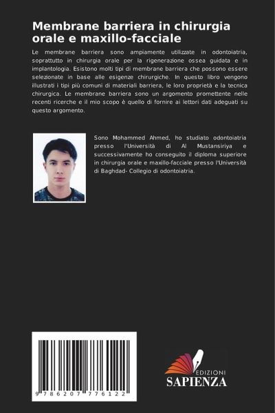 Le membrane barriera sono ampiamente utilizzate in odontoiatria, soprattutto in chirurgia orale per la rigenerazione ossea guidata e in implantologia. Esistono molti tipi di membrane barriera che possono essere selezionate in base alle esigenze chirurgiche. In questo libro vengono illustrati i tipi più comuni di materiali barriera, le loro proprietà e la tecnica chirurgica. Le membrane barriera sono un argomento promettente nelle recenti ricerche e il mio scopo è quello di fornire ai lettori dati adeguati su questo argomento.