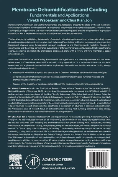 Membrane Dehumidification and Cooling: Fundamentals and Applications presents the state-of-the-art on membrane dehumidifiers, highlighting their most recent advancements and providing key insights into global R&D interests. With a strong focus on applications, the book offers characterization techniques to evaluate the potential of hygroscopic materials, as well as experimental methods to study the dehumidifiers' performance. The book begins by highlighting the demerits of conventional cooling systems and then reviews electrically driven alternative cooling solutions. A comparative study between different dehumidification techniques is also given, along with sections on fundamental transport mechanisms and thermodynamic modeling. Finally, scaling, heat transfer and thermodynamic analysis are presented, along with a review of hybrid membrane-based air-conditioners. This book is a one-stop resource for recent advancements in membrane dehumidification and cooling applications. It is an essential read for students, researchers and engineers interested in thermal engineering, heat and mass transfer, alternative cooling, energy materials and dehumidification.