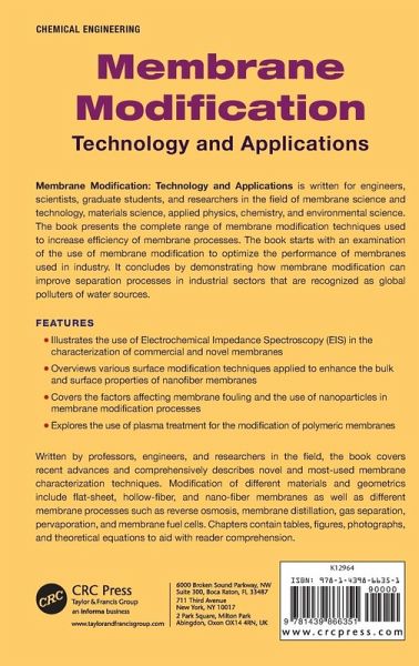 Membrane Modification: Technology and Applications is written for engineers, scientists, graduate students, and researchers in the field of membrane science and technology, materials science, applied physics, chemistry, and environmental science. The book presents the complete range of membrane modification techniques used to increase efficiency of membrane processes. The book starts with an examination of the use of membrane modification to optimize the performance of membranes used in industry. It concludes by demonstrating how membrane modification can improve separation processes in industrial sectors that are recognized as global polluters of water sources. Features Illustrates the use of Electrochemical Impedance Spectroscopy (EIS) in the characterization of commercial and novel membranes Overviews various surface modification techniques applied to enhance the bulk and surface properties of nanofiber membranes Covers the factors affecting membrane fouling and the use of nanoparticles in membrane modification processes Explores the use of plasma treatment for the modification of polymeric membranes Written by professors, engineers, and researchers in the field, the book covers recent advances and comprehensively describes novel and most-used membrane characterization techniques. Modification of different materials and geometrics include flat-sheet, hollow-fiber, and nano-fiber membranes as well as different membrane processes such as reverse osmosis, membrane distillation, gas separation, pervaporation, and membrane fuel cells. Chapters contain tables, figures, photographs, and theoretical equations to aid with reader comprehension.