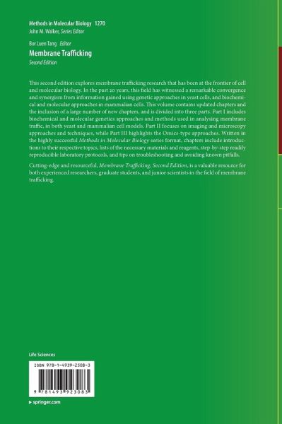 Intracellular Parcel Service: Current Issues in Intracellular Membrane Trafficking.- In vitro Analysis of the Mitochondrial Preprotein Import Machinery Using Recombinant Precursor Polypeptides.- Import of Proteins into Isolated Yeast Mitochondria.- Evaluation of Unconventional Protein Secretion in Saccharomyces cerevisiae.- Fractionation of Plasmodium-infected Human Red Blood Cells to Study Protein Trafficking.- Investigating Signalling Processes in Membrane Trafficking.- Recruitment of Coat Proteins to Liposomes and Peptidoliposomes.- A beta-lactamase Based Assay to Measure Surface Expression of Membrane Proteins.- Cell-free Reconstitution of Multivesicular Body (MVB) Cargo Sorting.- The Analysis of the Biogenesis of Lipid Droplets by Examining Rab40c Associating With Lipid Droplets.- Analysis of Conventional and Unconventional Trafficking of CFTR and Other Membrane Proteins.- Assessing Mammalian Autophagy.- Expression of Functional Myc-tagged Conserved Oligomeric Golgi (COG) Subcomplexes in Mammalian Cells.- Molecular and Cellular Characterization of GCC185, a Tethering Protein of the trans-Golgi Network.- Visualizing Toll-like Receptor-dependent Phagosomal Dynamics in Murine Dendritic Cells Using Live Cell Microscopy.- Understanding of Complex Protein Interactions with Respect to Anchorage Independence.- Application of Flow Cytometry to Analyse Intracellular Location and Trafficking of Cargo in Cell Populations.- Approaches to Analyze the Role of Rab GTPases in Endocytic Trafficking of Epidermal Growth Factor Receptor (EGFR).- Does Super Resolution Fluorescence Microscopy Obsolete Previous Microscopic Approaches to Protein Co-localization?.- Bimolecular Fluorescence Complementation (BiFC) Technique in Yeast Saccharomyces cerevisiae and Mammalian Cells.- Microscopic and Spectroscopic Techniques to Investigate Lipid Droplet Formation and Turnover in Yeast.- Image-based Identification of Nuclear Export Inhibitors From Natural Products.-Correlative Video-light-electron Microscopy of Mobile Organelles.- Live Cell Imaging of Endosomal Trafficking in Fungi.- Quantitative Analysis of Transferrin Cycling by Automated Fluorescence Microscopy.- Identification of Factors Regulating MET Receptor Endocytosis by High Throughput siRNA Screening.- Large-scale Analysis of Membrane Transport in Yeast Using Invertase Reporters.- RNAi Screens for Genes Involved in Golgi Glycosylation.- Proteomics Analyses of an Unique Bi-lobed Structure in Trypanosoma brucei.- Application of the Proximity-dependent Assay and Fluorescence Imaging Approaches to Study Viral Entry Pathways.