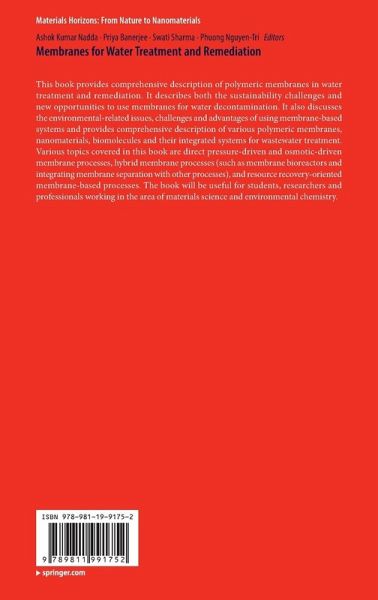 This book provides comprehensive description of polymeric membranes in water treatment and remediation. It describes both the sustainability challenges and new opportunities to use membranes for water decontamination. It also discusses the environmental-related issues, challenges and advantages of using membrane-based systems and provides comprehensive description of various polymeric membranes, nanomaterials, biomolecules and their integrated systems for wastewater treatment. Various topics covered in this book are direct pressure-driven and osmotic-driven membrane processes, hybrid membrane processes (such as membrane bioreactors and integrating membrane separation with other processes), and resource recovery-oriented membrane-based processes. The book will be useful for students, researchers and professionals working in the area of materials science and environmental chemistry.