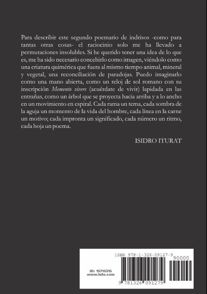 Para describir este segundo poemario de indrisos -como para tantas otras cosas- el raciocinio solo me ha llevado a permutaciones insolubles. Si he querido tener una idea de lo que es, me ha sido necesario concebirlo como imagen, viéndolo como una criatura quimérica que fuera al mismo tiempo animal, mineral y vegetal, una reconciliación de paradojas. Puedo imaginarlo como una mano abierta, como un reloj de sol romano con su inscripción Memento vivere (acuérdate de vivir) lapidada en las entrañas, como un árbol que se proyecta hacia arriba y a lo ancho en un movimiento en espiral. Cada rama un tema, cada sombra de la aguja un momento de la vida del hombre, cada línea en la carne un motivo; cada impronta un significado, cada número un ritmo, cada hoja un poema. ISIDRO ITURAT