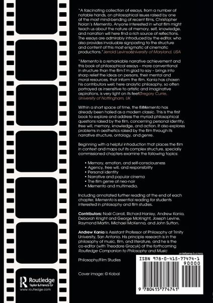 'Memento is a remarkable narrative achievement and this book of philosophical essays - more conventional in structure than the film I'm glad to say - brings into sharp relief the ideas on persons, their mental and moral resources, that inform the film. Kania has chosen his contributors well; here analytic philosophy, so often portrayed as insensitive to artistic and imaginative aspirations, is very light on its feet.' - Gregory Currie, University of Nottingham, UK