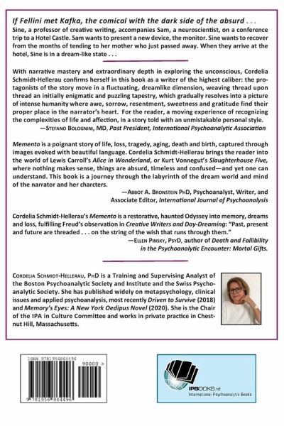 If Fellini met Kafka, the comical with the dark side of the absurd . . . Sine, a professor of creative writing, accompanies Sam, a neuroscientist, on a conference trip to a Hotel Castle. Sam wants to present a new device, the monitor. Sine wants to recover from the months of tending to her mother who just passed away. When they arrive at the hotel, Sine is in a dreamlike state . . . With refined narrative mastery and extraordinary depth in exploring the unconscious, Cordelia Schmidt-Hellerau confirms herself in this book as a writer of the highest caliber: the protagonists of the story move in a fluctuating, dreamlike dimension, between synchronicity and diachronicity, and page after page they become more real than real, just as in dreams. The tale weaves thread upon thread an initially enigmatic and puzzling tapestry, which gradually resolves into a picture of intense humanity where awe, sorrow, resentment, sweetness and gratitude find their proper place in the narrator's heart. For the reader, a moving experience of recognizing the complexities of life and affection, without discounting or self-deception, in a story dreamed and told with an unmistakable personal style. -Stefano Bolognini, MD, IPA Past President Memento is a poignant story of life, loss, tragedy, aging, death and birth. The main character Sine and her internal world and life are vividly captured through the images evoked within the reader with beautiful language. One is brought forwards and backwards within this personal world of Sine, her relationships to herself and others, and the loss and reappearance of them in many forms that populate her mind. As a psychoanalyst and novelist, Cordelia Schmidt-Hellerau brings the reader into the world of Lewis Carroll's Alice in Wonderland, or Kurt Vonnegut's Slaughterhouse Five, where nothing makes sense, things are absurd, timeless and confused - and yet one can understand. This book is a journey through the labyrinth of the dream world and mind of the narrator and her characters. -Abbot A. Bronstein Ph.D., Psychoanalyst, Writer, and Associate Editor International Journal of Psychoanalysis Cordelia Schmidt-Hellerau's Memento is a restorative, haunted Odyssey into memory, dreams and loss, fulfilling Freud's observation in -Creative Writers and Day-Dreaming: "Past, present and future are threaded . . . on the string of the wish that runs through them." -Ellen Pinsky, PsyD, author of Death and Fallibility in the Psychoanalytic Encounter: Mortal Gifts.