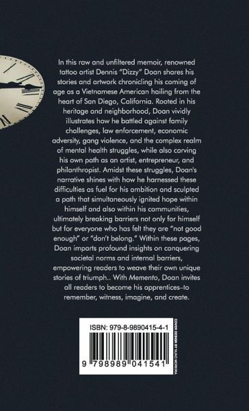 In this raw and unfiltered memoir, renowned tattoo artist Dennis "Dizzy" Doan shares his stories and artwork chronicling his coming of age as a Vietnamese American hailing from the heart of San Diego, California. Rooted in his heritage and neighborhood, Doan vividly illustrates how he battled against family challenges, economic adversity, gang violence, and the complex realm of mental health struggles, while also carving his own path as an artist, entrepreneur, and philanthropist. Amidst these struggles, Doan's narrative shines with how he harnessed these difficulties as fuel for his ambition and sculpted a path that simultaneously ignited hope within himself and also within his communities, ultimately breaking barriers not only for himself but for everyone who has felt they are "not good enough" or "don't belong." Within these pages, Doan imparts profound insights on conquering societal norms and internal barriers, empowering readers to weave their own unique stories of triumph. With Memento, Doan invites all readers to become his apprentices-to remember, witness, imagine, and create.