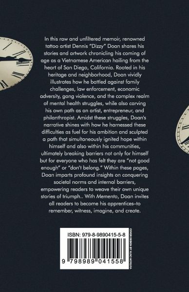 In this raw and unfiltered memoir, renowned tattoo artist Dennis "Dizzy" Doan shares his stories and artwork chronicling his coming of age as a Vietnamese American hailing from the heart of San Diego, California. Rooted in his heritage and neighborhood, Doan vividly illustrates how he battled against family challenges, economic adversity, gang violence, and the complex realm of mental health struggles, while also carving his own path as an artist, entrepreneur, and philanthropist. Amidst these struggles, Doan's narrative shines with how he harnessed these difficulties as fuel for his ambition and sculpted a path that simultaneously ignited hope within himself and also within his communities, ultimately breaking barriers not only for himself but for everyone who has felt they are "not good enough" or "don't belong." Within these pages, Doan imparts profound insights on conquering societal norms and internal barriers, empowering readers to weave their own unique stories of triumph. With Memento, Doan invites all readers to become his apprentices-to remember, witness, imagine, and create.