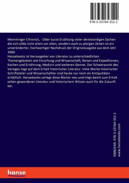 Memminger Chronick, - Oder kurze Erzählung vieler denkwürdigen Sachen die sich allda nicht allein vor alten, sondern auch zu jetzigen Zeiten ist ein unveränderter, hochwertiger Nachdruck der Originalausgabe aus dem Jahr 1660.Hansebooks ist Herausgeber von Literatur zu unterschiedlichen Themengebieten wie Forschung und Wissenschaft, Reisen und Expeditionen, Kochen und Ernährung, Medizin und weiteren Genres. Der Schwerpunkt des Verlages liegt auf dem Erhalt historischer Literatur. Viele Werke historischer Schriftsteller und Wissenschaftler sind heute nur noch als Antiquitäten erhältlich. Hansebooks verlegt diese Bücher neu und trägt damit zum Erhalt selten gewordener Literatur und historischem Wissen auch für die Zukunft bei.