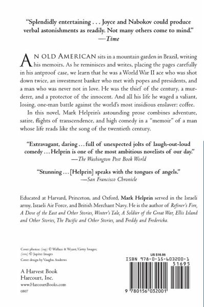 An old American who lives in Brazil is writing his memoirs. An English teacher at the naval academy, he is married to a woman young enough to be his daughter and has a little son whom he loves. He sits in a mountain garden in Niterói, overlooking the ocean. As he reminisces and writes, placing the pages carefully in his antproof case, we learn that he was a World War II ace who was shot down twice, an investment banker who met with popes and presidents, and a man who was never not in love. He was the thief of the century, a murderer, and a protector of the innocent. And all his life he waged a valiant, losing, one-man battle against the world's most insidious enslaver: coffee. Mark Helprin combines adventure, satire, flights of transcendence, and high comedy in this "memoir" of a man whose life reads like the song of the twentieth century.