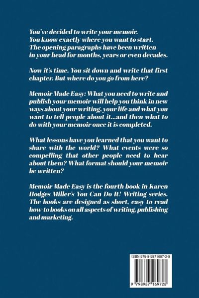 You've decided to write your memoir. You know exactly where you want to start. The opening paragraphs have been written in your head for months, years or even decades. Now it's time. You sit down and write that first chapter. But where do you go from here? Memoir Made Easy: What you need to write and publish your memoir will help you think in new ways about your writing, your life, and what you want to tell people about it...and then what to do with your memoir once it is completed. What lessons have you learned that you want to share with the world? What events were so compelling that other people need to hear about them? In what format should your memoir be written? Memoir Made Easy is the fourth book in Karen Hodges Miller's You Can Do It! Writing series. The books are designed as short, easy-to-read how-to books on all aspects of writing, publishing, and marketing.
