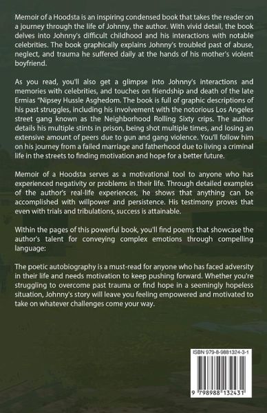 Memoir of a Hoodsta is an inspiring condensed book that takes the reader on a journey through the life of Johnny, the author. With vivid detail, the book delves into Johnny's difficult childhood and his interactions with notable celebrities. The book graphically explains Johnny's troubled past of abuse, neglect, and trauma he suffered daily at the hands of his mother's violent boyfriend.As you read, you'll also get a glimpse into Johnny's interactions and memories with celebrities, and touches on friendship and death of the late Ermias "Nipsey Hussle" Asghedom. The book is full of graphic descriptions of his past struggles, including his involvement with the notorious Los Angeles street gang known as the Neighborhood Rolling Sixty Crips. The author details his multiple stints in prison, being shot multiple times, and losing an extensive amount of peers due to gun and gang violence. You'll follow him on his journey from a failed marriage and fatherhood due to living a criminal life in the streets to finding motivation and hope for a better future.Memoir of a Hoodsta serves as a motivational tool to anyone who has experienced negativity or problems in their life. Through detailed examples of the author's real-life experiences, he shows that anything can be accomplished with willpower and persistence. His testimony proves that even with trials and tribulations, success is attainable.Within the pages of this powerful book, you'll find poems that showcase the author's talent for conveying complex emotions through compelling language:The poetic autobiography is a must-read for anyone who has faced adversity in their life and needs motivation to keep pushing forward. Whether you're struggling to overcome past trauma or find hope in a seemingly hopeless situation, Johnny's story will leave you feeling empowered and motivated to take on whatever challenges come your way.