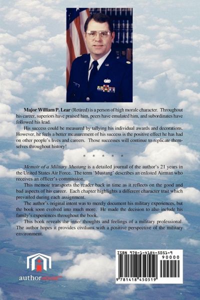 Memoir of a Military Mustang is a detailed journal of the author's 21 years of service in the United States Air Force. The word 'mustang' is military slang used to describe an enlisted person who eventually receives an officer's commission. The author served seven years in the enlisted ranks before securing an officer's commission. While sorting through numerous military documents and memorabilia, Major Lear began recalling many of his previous military experiences. This book transports the reader back in time as it reflects on the many ups and downs of his military career. Each chapter highlights a different character trait which was most prevalent during each particular time frame. The author's original intent was to simply document his military experiences; however, the book soon evolved into much more. Life in the military can be lonely if you have no family to share it with. Since his family was so important to his military career, he decided to include their personal experiences within the book. Memoir of a Military Mustang reveals the inner thoughts and feelings of a military professional. While many of the stories he relates are true, some names have been changed to protect the privacy of those individuals. The author hopes the book will provide readers with a positive perspective of the military environment.