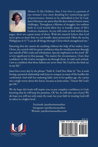 Memoir To My Children: How I Got Over is a portrait of one woman's true story detailing her unwavering spirit of perseverance, known to be embedded in her by God. Janet Harrison can attest that life does indeed feature many challenges. Throughout a lifetime of struggles, her resilient faith in God would allow her to handle many of life's hardcore situations. As you will come to find within these pages, there are a great many of them. With the staunch believe that God never gives us more than we can handle, Janet persevered. Often she recites Philippians 4:13 "I can do all things through Christ which strengthened me. " Knowing that she cannot do anything without the help of her maker, Jesus Christ, she carried with her great confidence that she would persevere through any and all of life's trials and tribulations. Special emphasize on the word "all" is very significant in that passage. "No matter the circumstances, I have that confidence in My God to strengthen me through them. So with each setback, I am so confident that those failures are never final. My God has the final say in my life." Janet lives every day by the phrase "Faith It, Until You Make It." Yes, it took having a personal relationship with Jesus to conquer so many of the hurdles she confronted. And with her enduring faith, now in her golden age, she carries not a single worry about the future, because as Janet states, "I know My God's got Me." We do hope this book will inspire you to put complete confidence in God, knowing that he will keep his promises. Oh Yes, he will take care of you! We do hope you will not only enjoy the read, but your faith in trusting God will be taken to a higher level. Facebook: janetharrisonauthor Instagram: janetharrisonauthor Website: janetharrisonauthor.com