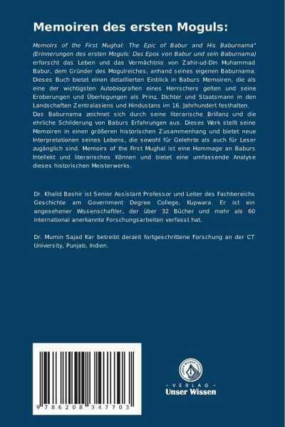 Memoirs of the First Mughal: The Epic of Babur and His Baburnama" (Erinnerungen des ersten Moguls: Das Epos von Babur und sein Baburnama) erforscht das Leben und das Vermächtnis von Zahir-ud-Din Muhammad Babur, dem Gründer des Mogulreiches, anhand seines eigenen Baburnama. Dieses Buch bietet einen detaillierten Einblick in Baburs Memoiren, die als eine der wichtigsten Autobiografien eines Herrschers gelten und seine Eroberungen und Überlegungen als Prinz, Dichter und Staatsmann in den Landschaften Zentralasiens und Hindustans im 16. Jahrhundert festhalten.Das Baburnama zeichnet sich durch seine literarische Brillanz und die ehrliche Schilderung von Baburs Erfahrungen aus. Dieses Werk stellt seine Memoiren in einen größeren historischen Zusammenhang und bietet neue Interpretationen seines Lebens, die sowohl für Gelehrte als auch für Leser zugänglich sind. Memoirs of the First Mughal ist eine Hommage an Baburs Intellekt und literarisches Können und bietet eine umfassende Analyse dieses historischen Meisterwerks.
