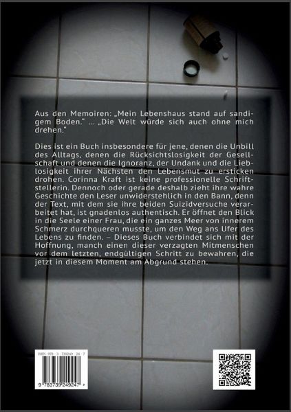 Aus den Memoiren: "Mein Lebenshaus stand auf sandigem Boden." ... "Die Welt würde sich auch ohne mich drehen." Dies ist ein Buch, insbesondere für jene, denen die Unbill des Alltags, denen die Rücksichtslosigkeit der Gesellschaft und denen die Ignoranz, der Undank und die Lieblosigkeit ihrer Nächsten den Lebensmut zu ersticken drohen. Corinna Kraft ist keine professionelle Schriftstellerin. Dennoch, oder gerade deshalb zieht ihre wahre Geschichte den Leser unwiderstehlich in den Bann, denn der Text, mit dem sie ihre beiden Suizidversuche verarbeitet hat, ist gnadenlos authentisch. Er öffnet den Blick in die Seele einer Frau, die ein ganzes Meer von innerem Schmerz durchqueren musste, um den Weg ans Ufer des Lebens zu finden. Dieses Buch verbindet sich mit der Hoffnung, manch einen dieser verzagten Mitmenschen vor dem letzten, endgültigen Schritt zu bewahren, die jetzt in diesem Moment am Abgrund stehen.