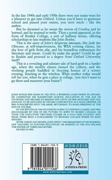 In the late 1940s and early 1950s there were not many ways for a labourer to get into Oxford. Unless you'd been to grammar school and passed your exams, you were stuck - like the author. But he dreamed as he swept the streets of Cowley, and he burned, and he yearned to write. Then a portal appeared, in the form of Ruskin College, a sort of halfway house, offering scholarships to late students like John Boyles. This is the story of John's desperate attempts, like Jude the Obscure, at self-improvement, his WEA evening classes, his shy love of girls from afar, and his boundless enthusiasm for literature and music. Could he make the grade? Could he get to Ruskin and proceed to a degree from Oxford University itself? This is a revealing and salutary tale of hard graft in a harder age, when the middle classes owned the culture, and the working people huddled in freezing homes of a winter evening, listening to the wireless. What mother today would tell her son, when he gets a place at college, 'you don't want to go there and mammer your brains'? JOHN BOYLES WAS BORN IN 1922 INTO A WORKING-CLASS FAMILY IN OXFORD. HE COMPLETED HIS ELEMENTARY SCHOOL EDUCATION AT THE AGE OF FOURTEEN AND BECAME AN ERRAND BOY UNTIL HE WAS EIGHTEEN AND OLD ENOUGH TO BE EMPLOYED BY OXFORD CORPORATION AS A ROAD-SWEEPER. HE WAS CONSCRIPTED INTO THE ARMY, RETURNING TO ROAD-SWEEPING AT THE END OF THE WAR. IN THE WINTER OF 1946 HE STARTED GOING TO EVENING CLASSES, AND WAS ENCOURAGED BY ONE OF HIS TUTORS TO APPLY TO RUSKIN COLLEGE. HE TOOK THE STATUTORY TWO-YEAR COURSE AS A FULL-TIME STUDENT AND FROM THERE WON A SCHOLARSHIP TO WADHAM COLLEGE WHERE HE READ ENGLISH. AFTER TAKING HIS DEGREE, JOHN SPENT THE REMAINDER OF HIS WORKING LIFE TEACHING IN FURTHER EDUCATION. HE MARRIED IN 1956 AND BECAME THE FATHER OF THREE DAUGHTERS. HE DIED IN 2001.