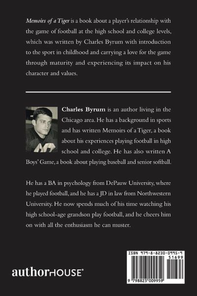 Memoirs of a Tiger is a book about a player's relationship with the game of football at the high school and college levels, which was written by Charles Byrum with introduction to the sport in childhood and carrying a love for the game through maturity and experiencing its impact on his character and values.