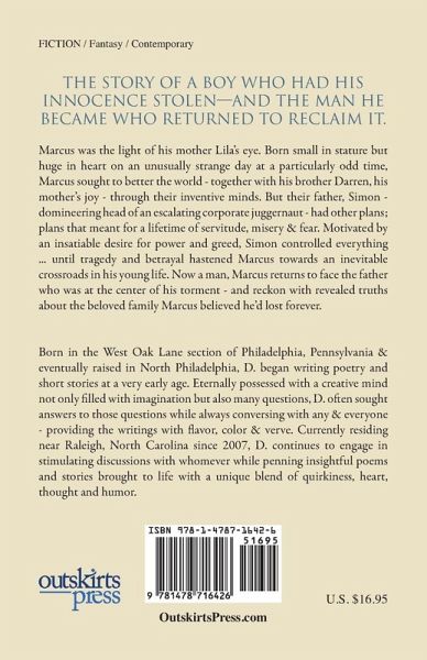 Pride from your parents. Approval from one's peers. Acceptance from society. These primary, fundamental things are critical - so important to our children but none so much as existence. Every child desires acknowledgment on some level from those around them - be it people who see them every day to those who birthed them. A child's desire to be recognized - to be seen, heard & known is as essential as that child's basic need to be loved unconditionally. This is the story of one such child, Marcus. Marcus is the younger brother of an incredibly gifted young boy, Darren. Born of small stature along with an unbelievable yet undiscovered aptitude on a peculiar night during a freakish display of nature, Marcus also possesses the astonishing & often frightening tendency to actually diminish in appearance whenever mistreated by those he loved. Together, the combined abilities of these brothers improve the world in which they live & benefit humanity everywhere. The public regards them as geniuses while they remain the cherished jewels of their mother, Lila's, eyes - her steadfast love, gentle nurturing & never-ending support are the cornerstones of the precious link between the two siblings. However, Lila's husband & the boy's father, Simon, is a heartless, overbearing, relentless presence who views his sons only as avenues of endless revenue & indispensable in not only building but sustaining an immense enterprise built on a foundation of terrible secrets, abuse, neglect & treachery. Necessary only if his children make & keep their father wealthy, the world was never aware of the horrible environment the children and their mother endured for many years ... surroundings & situations that will inevitably tear a family irreparably apart while forcing one young man to grow, stand strong & eventually come to terms with his life-long tormentor.