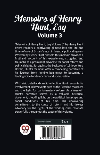"Memoirs of Henry Hunt, Esq Volume 3" by Henry Hunt offers readers a captivating glimpse into the life and times of one of Britain's most influential political figures. Written by Henry Hunt himself, this memoir provides a firsthand account of his experiences, struggles, and triumphs as a prominent advocate for social reform and political rights. Set against the backdrop of 19th-century Britain, Hunt's memoirs offer a compelling narrative of his journey from humble beginnings to becoming a leading voice for democracy and social justice. With vivid detail and candid reflection, Hunt recounts his involvement in key events such as the Peterloo Massacre and the fight for parliamentary reform. As a memoir, Hunt's narrative serves as a valuable historical document, shedding light on the political landscape and social conditions of his time. His unwavering commitment to the cause of reform and his tireless advocacy for the rights of the working class resonate powerfully throughout the pages of this volume.