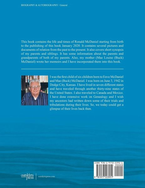 Want to know more about the life and times of Ronald Dee McDaniel, born June 3, 1942. He was born in Dodge City, Kansas and is the first child of six children born to Enve McDaniel and Mae Louise (Buck) McDaniel. This book covers his life from his birth to January 2020. It covers three generations before and three generations after him. Also, incorporated in this book are his mother's memoirs (Mae Louise (Buck) McDaniel. She was born May 10, 1922 in Garfield, Kansas. Her memoirs were written in her own words with very very few grammar changes. It covers things that happened in her life from her childhood to shortly before her death on January 1,2014. There are several pictures of people that are several generations back and documents, such as death certificate, marriage license, birth certificates and etc. are included.