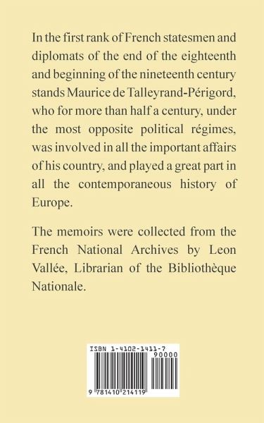 In the first rank of French statesmen and diplomats of the end of the eighteenth and beginning of the nineteenth century stands Maurice de Talleyrand-Perigord, who for more than half a century, under the most opposite political regimes, was involved in all the important affairs of his country, and played a great part in all the contemporaneous history of Europe. The memoirs were collected from the French National Archives by Leon Vallee, Librarian of the Bibliotheque Nationale.