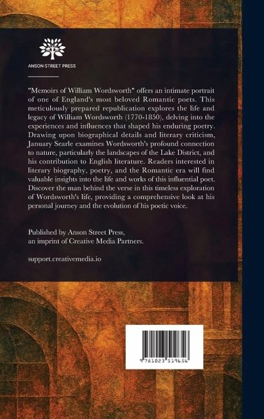 "Memoirs of William Wordsworth" offers an intimate portrait of one of England's most beloved Romantic poets. This meticulously prepared republication explores the life and legacy of William Wordsworth (1770-1850), delving into the experiences and influences that shaped his enduring poetry. Drawing upon biographical details and literary criticism, January Searle examines Wordsworth's profound connection to nature, particularly the landscapes of the Lake District, and his contribution to English literature. Readers interested in literary biography, poetry, and the Romantic era will find valuable insights into the life and works of this influential poet. Discover the man behind the verse in this timeless exploration of Wordsworth's life, providing a comprehensive look at his personal journey and the evolution of his poetic voice. This work has been selected by scholars as being culturally important, and is part of the knowledge base of civilization as we know it. This work is in the public domain in the United States of America, and possibly other nations. Within the United States, you may freely copy and distribute this work, as no entity (individual or corporate) has a copyright on the body of the work. Scholars believe, and we concur, that this work is important enough to be preserved, reproduced, and made generally available to the public. We appreciate your support of the preservation process, and thank you for being an important part of keeping this knowledge alive and relevant.