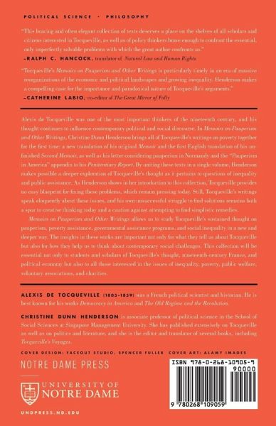 The collection includes new translations of Tocqueville's works, including the first English translation of his Second Memoir, the original Memoir, a letter fragment considering pauperism in Normandy, and the ''Pauperism in America'' index to the Penitentiary Report. Alexis de Tocqueville was one of the most important thinkers of the nineteenth century, and his thought continues to influence contemporary political and social discourse. In Memoirs on Pauperism and Other Writings, Christine Dunn Henderson brings all of Tocqueville's writings on poverty together for the first time: a new translation of his original Memoir and the first English translation of his unfinished Second Memoir, as well as his letter considering pauperism in Normandy and the ''Pauperism in America'' appendix to his Penitentiary Report. By uniting these texts in a single volume, Henderson makes possible a deeper exploration of Tocqueville's thought as it pertains to questions of inequality and public assistance. As Henderson shows in her introduction to this collection, Tocqueville provides no easy blueprint for fixing these problems, which remain pressing today. Still, Tocqueville's writings speak eloquently about these issues, and his own unsuccessful struggle to find solutions remains both a spur to creative thinking today and a caution against attempting to find simplistic remedies. Memoirs on Pauperism and Other Writings allows us to study his sustained thought on pauperism, poverty assistance, governmental assistance programs, and social inequality in a new and deeper way. The insights in these works are important not only for what they tell us about Tocqueville but also for how they help us to think about contemporary social challenges. This collection will be essential not only to students and scholars of Tocqueville's thought, nineteenth-century France, and political economy, but also to all those interested in the issues of public assistance, associative life, voluntary associations, and charities.