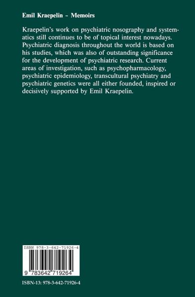 When Emil Kraepelin died (15. 02. 1856-07. 10. 1926), he left behind his memoirs, which were not published until today. Co-workers and col leagues from the last years of Kraepelin's life and his family knew that such an autobiography existed, but they were not sure whether these memoirs should be made public, so they remained unpublished. At a commemoration 50 years after Emil Kraepelin's death in Mu nich (1976) the descendants, who attended the festivities, agreed to the editors' suggestion to publish the "Memoirs". Through this publication we have been able to learn more about the life of a man, whose work has had a decisive and lasting effect on the entire psychiatry since the end of the last century. When one reads the memoirs, one has to admit that on ly very little is known about this great psychiatrist's personality and path through life and that this gap has by no means been filled by the publica tion of his memoirs. Perhaps this publication will encourage work on a biography, which will give us more information on Kraepelin's person ality, life and scientific work. The focal-point of Kraepelin's work lies in the classification of psy chiatric clinical syndromes, which was developed from clinical observa tions, was constantly tested empirically and was altered taking new findings and knowledge into account. However, the basis of this system has remained unchanged and valid until today.