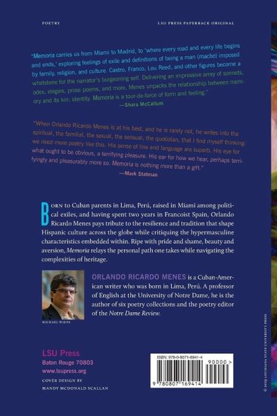 Born to Cuban parents in Lima, Perú, raised in Miami among political exiles, and having spent two years in Francoist Spain, Orlando Ricardo Menes pays tribute to the resilience and tradition that shape Hispanic culture across the globe while critiquing the hypermasculine characteristics embedded within. Ripe with pride and shame, beauty and aversion, Memoria relays the personal path one takes while navigating the complexities of heritage. Throughout his life, the ever-present concept of machismo has created turmoil and grief for Menes, who aligns his sensibilities with a more compassionate expression of masculinity. In poems about the Franco dictatorship and the Spanish Civil War, Menes assails the fascists' preoccupation with violence and domination as tokens of manliness. Meditations on the music of Menes's youth also underscore a young man's desire for alternative versions of manhood. Alice Cooper and Lou Reed offer examples of self-liberation from the repressive regime: "Cropped head, whitewashed face, O Lou, our goth-butch apostle / In skintight leather pants, eagle's-head buckle on a rhinestone belt . . .Our mothers horrified to have borne sons so twisted, so perverse, / Their mop sticks primed to beat us into Marlboro Men." Menes balances these unflinching criticisms with celebratory lines for España as a mother country: "We . . . sailed in silence on the asphalt currents / to Madrid's Puerta del Sol, our little car/ gliding like a caravel to this Gate of the Sun, / Spain's navel, point zero, her alpha and omega, / where the empire was born and died, / where every road and every life begins and ends." Menes's honest embrace of his heritage includes fond remembrance of his mother, "we talked about your house in / Havana, so close to the bay your young eyes winced / in salt air," and sincere expressions of cultural reckoning, "Nations die but blood lives forever in la memoria, / So pray to your Abuelo as you would God Himself / Who made earth, sky, and water from the void." At once rich with sensorial memories and rife with conflicts of identity, Memoria expands representations of Hispanic culture while drawing on universal themes of love, belonging, and rebellion.
