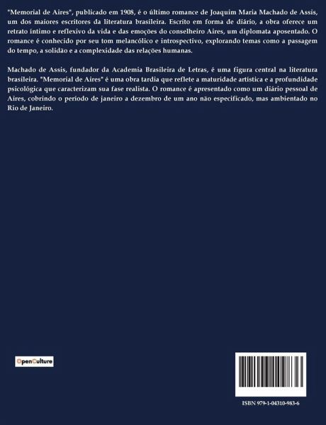 "Memorial de Aires", publicado em 1908, é o último romance de Joaquim Maria Machado de Assis, um dos maiores escritores da literatura brasileira. Escrito em forma de diário, a obra oferece um retrato íntimo e reflexivo da vida e das emoções do conselheiro Aires, um diplomata aposentado. O romance é conhecido por seu tom melancólico e introspectivo, explorando temas como a passagem do tempo, a solidão e a complexidade das relações humanas. Machado de Assis, fundador da Academia Brasileira de Letras, é uma figura central na literatura brasileira. "Memorial de Aires" é uma obra tardia que reflete a maturidade artística e a profundidade psicológica que caracterizam sua fase realista. O romance é apresentado como um diário pessoal de Aires, cobrindo o período de janeiro a dezembro de um ano não especificado, mas ambientado no Rio de Janeiro.