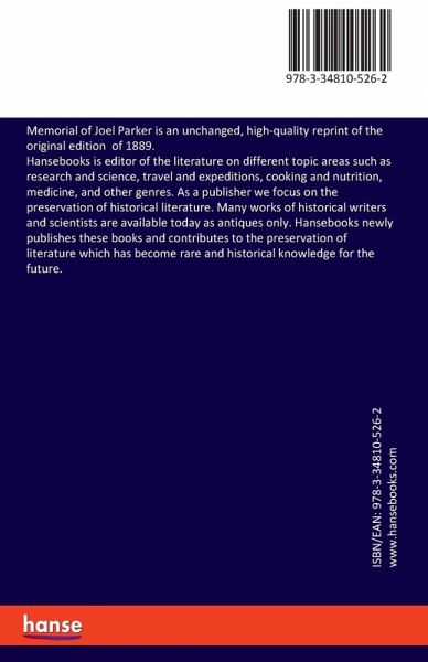 Memorial of Joel Parker is an unchanged, high-quality reprint of the original edition of 1889.Hansebooks is editor of the literature on different topic areas such as research and science, travel and expeditions, cooking and nutrition, medicine, and other genres. As a publisher we focus on the preservation of historical literature. Many works of historical writers and scientists are available today as antiques only. Hansebooks newly publishes these books and contributes to the preservation of literature which has become rare and historical knowledge for the future.