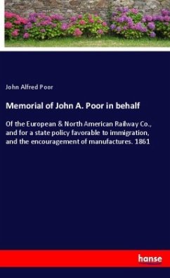 Memorial of John A. Poor in behalf - Of the European & North American Railway Co., and for a state policy favorable to immigration, and the encouragement of manufactures. 1861 is an unchanged, high-quality reprint of the original edition of 1861.Hansebooks is editor of the literature on different topic areas such as research and science, travel and expeditions, cooking and nutrition, medicine, and other genres. As a publisher we focus on the preservation of historical literature. Many works of historical writers and scientists are available today as antiques only. Hansebooks newly publishes these books and contributes to the preservation of literature which has become rare and historical knowledge for the future.