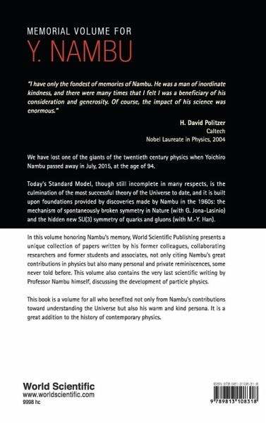 "I have only the fondest of memories of Nambu. He was a man of inordinate kindness, and there were many times that I felt I was a beneficiary of his consideration and generosity. Of course, the impact of his science was enormous." H David Politzer Caltech Nobel Laureate in Physics, 2004 "Through these contributions, the reader can gain an idea of the importance and variety of Nambu's work, as well as learn about his personality. He is described by many of those who knew him as kind, warm and humble. Besides being very clever and "many years ahead", he was also a good mentor." CERN Courier We have lost one of the giants of the twentieth century physics when Yoichiro Nambu passed away in July, 2015, at the age of 94. Today's Standard Model, though still incomplete in many respects, is the culmination of the most successful theory of the Universe to date, and it is built upon foundations provided by discoveries made by Nambu in the 1960s: the mechanism of spontaneously broken symmetry in Nature (with G Jona-Lasinio) and the hidden new SU(3) symmetry of quarks and gluons (with M-Y Han). In this volume honoring Nambu's memory, World Scientific Publishing presents a unique collection of papers written by his former colleagues, collaborating researchers and former students and associates, not only citing Nambu's great contributions in physics but also many personal and private reminiscences, some never told before. This volume also contains the very last scientific writing by Professor Nambu himself, discussing the development of particle physics. This book is a volume for all who benefited not only from Nambu's contributions toward understanding the Universe but also his warm and kind persona. It is a great addition to the history of contemporary physics.