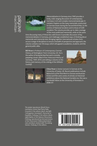 List of Illustrations Notes on Contributors Introduction; B.Niven & C.Paver PART I: REMEMBERING GERMAN LOSSES The Volkstrauertag (People's Day of Mourning), from 1922 to the Present; A.Kaiser Beyond Usable Pasts: Rethinking the Memorialisation of the Strategic Air War in Germany, 1940 to 1965; J.Arnold Roads to Revision: Disputes over Street Names Referring to the German Eastern Territories after the First and Second World War in the Cities of Dresden and Mainz, 1921-1972; C.Lotz Monuments and Commemorative Sites for German Expellees A Memorial Laisser-Passez? Church Exhibitions and National Victimhood in Germany; D.Sandler Remembering on Foreign Soil: The Activities of the German War Graves Commission; D.Livingstone Neither Here nor There? Memorialisation of the Expulsion of Ethnic Germans; D.Kift PART II: REMEMBERING NAZI CRIMES, PERPETRATORS AND VICTIMS Memorialisation Endeavours of the Regional Offices for Political Education (Landeszentralen für Politische Bildung); D.K.Buse Memorialisation of Perpetrator Sites in Bavaria'; M.Urban Pieces of the Past: Souvenirs from Nazi Sites - The Example of Peenemünde; U.Dittrich Remembering Euthanasia: Grafeneck in the Past, Present and Future; S.C.Knittel Remembering Prisoners of War as Victims of National Socialist Persecution and Murder in Post-War Germany; J.Nagel (In)Visible Trauma: Michael Elmgreen and Ingar Dragset's Memorial to the Homosexuals Persecuted under the National Socialist Regime; T.O.Haakenson Memorialising the White Rose Resistance Group in Post-War Germany; K.Rickard The Role of German Perpetrator Sites in Teaching and Confronting the Nazi Past ; C.Pearce PART III: REMEMBERING JEWISH SUFFERING Memorialisation through Documentation: Holocaust Commemoration among Jewish Displaced Persons in Allied-Occupied Germany; L.Jockusch Memorialising Persecuted Jews in Dachau and Other West German Concentration Camp Memorial Sites ; H.Marcuse Remembering Nazi Anti-Semitism in the GDR; B.Niven Rosenstraße: AComplex Site of German-Jewish Memory; H.J.Potter The Counter-Monument: Memory Shaped by Male Post-War Legacy?; C.Tomberger Stumbling Blocks: A Decentralised Memorial to Holocaust Victims; M.Imort Affective Memory, Ineffective Functionality: Experiencing Berlin's Memorial to the Murdered Jews of Europe; B.Sion From Monuments to Installations: Aspects of Memorialisation in Historical Exhibitions about the National Socialist Era; C.Paver PART IV: SOCIALIST MEMORY AND MEMORY OF SOCIALISM Heroes and Victims: The Aesthetics and Ideology of Monuments and Memorials in the GDR; S.Scharnowski Beating Nazis and Exporting Socialism: Representing East German War Memory to Foreign Tourists; L.Fallwell Memorialising Socialist Contradictions: A 'Think-Mark' for Rosa Luxemburg in the New Berlin; R.Bavaj Challenging or Concretising Cold War Narratives? Berlin's Memorial to the Victims of 17 June 1953'; A.Saunders Mia Lee (University of Warwick): 'GDR Monuments in Unified Germany; M.Lee Memorialisation of the German-German Border in the Context of Constructions of Heimat; G.Knischewski & U.Spittler The Fight in the Prison Car Park: Memorialising Germany's 'Double Past' in Torgau since 1990; A.Beattie PART V:MEMORIALISING GERMANY'S AMBIVALENT LEGACIES Martin Luther - Rebel, Genius, Liberator: Politics and Marketing 1517-2017; U.Zitzlsperger Building Up and Tearing Down the Myth of German Colonialism: Colonial Denkmale and Mahnmale after 1945; J.Verber Remembering the Battle of Jutland in Post-War Wilhelmshaven; G.Götz The Memorialisation of 9 November 1918 in the Two German States; A.Segelke A Democratic Legacy? The Memorialisation of the Weimar Republic and the Politcs of History of the Federal Republic of Germany; S.Ullrich Memorialising the Military: Traditions, Exhibitions, and Monuments in the West German Army from the 1950s ; J.Echternkamp The Legacy of Second German Empire Memorials after 1945; B.Niven Notes